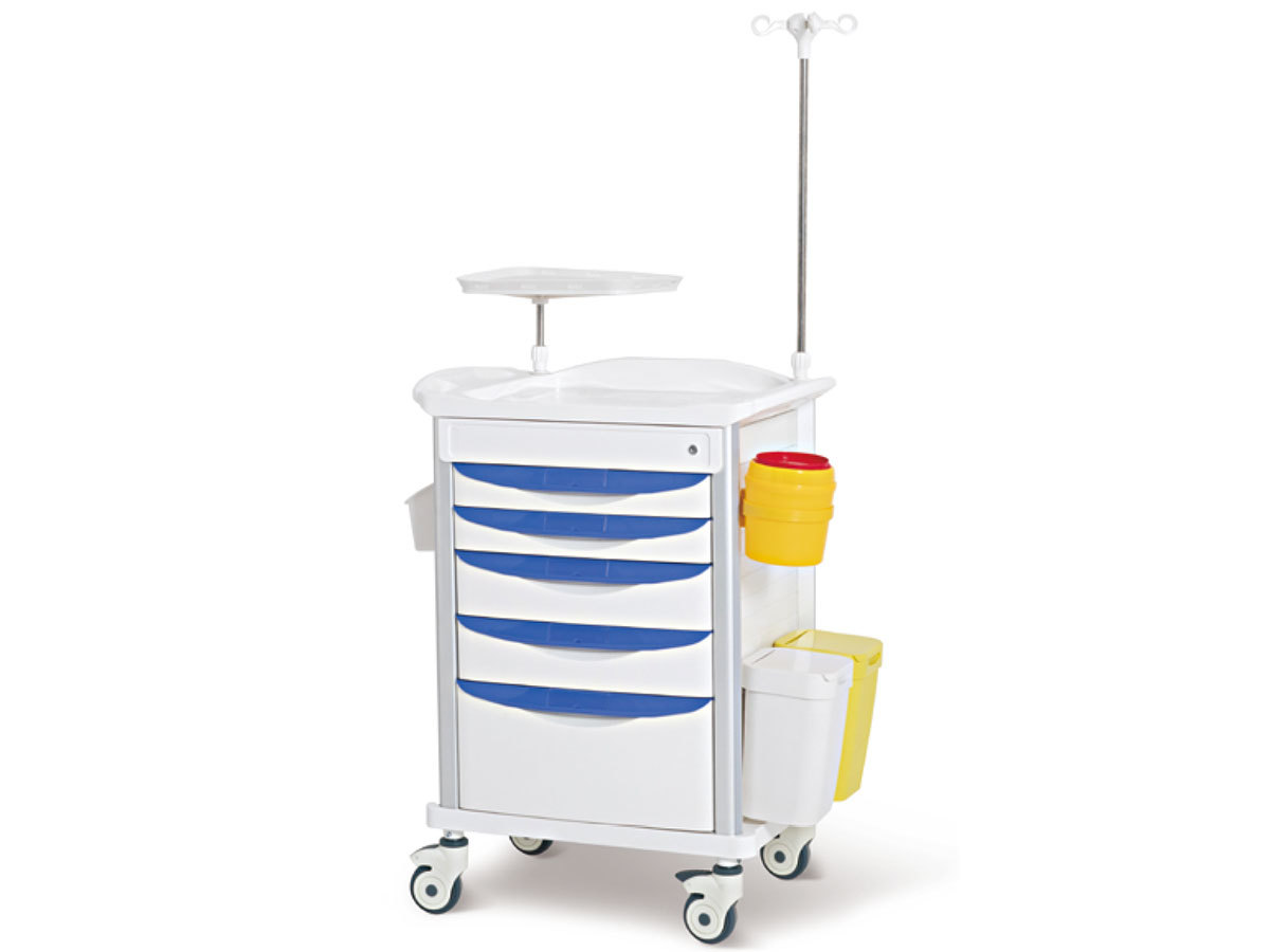 功能:ABS注塑成型,两侧带扶手,推行方便;护栏三面防护,防止物品滑落;配置有五层抽屉,内置分隔片,可自由分隔;燕尾蝶抽屉拉手、封口插槽式标识牌;左侧配有除颤器平台、隐藏式伸缩副工作台、置物盒;右侧配有隐藏式伸缩输液架、锐器盒、ABS双污物桶分 色;背部配有除颤板,隐藏式伸缩氧气瓶支架,活动电源线 。
